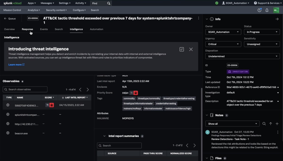 Bring together workflows across detection, investigation and response with Mission Control. Native integration with Splunk's leading SOAR solution, automated playbooks are infused with threat intelligence that brings together and normalizes the scoring of data sources. Response Plans directly in Splunk Enterprise Security allow users to collaborate and execute incident response workflows for common security use cases easily.